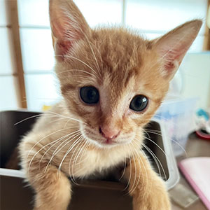 海(かい)メス(1か月) 里親募集中の猫 2025.10.16 里親募集中の猫 生まれ (推定)体重柄 茶トラ 性格 人慣れ好きなもの食事 ウィルス検査 陰性検便 レボリューション ワクチン避妊・去勢 入所経緯 入所 トライアル 譲渡
